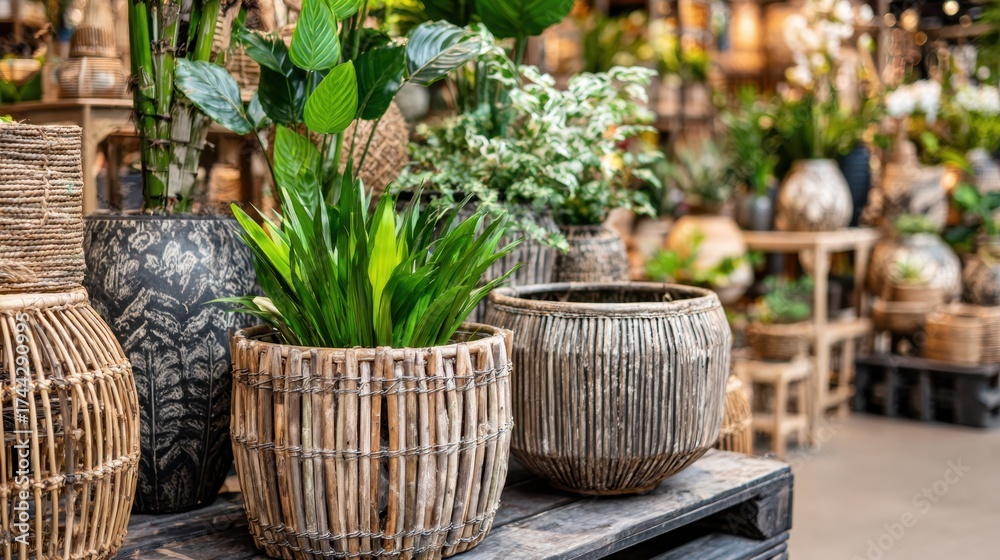 WEBLUX obraz na plátně 1D, 3D, 4D, 5D - Closeup of ecoconscious decor elements including bamboo vases and greenery in a middlefocused plant pot with the soft blur of sustainable wooden furniture in the background.