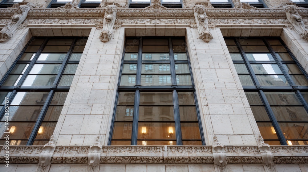 WEBLUX obraz na plátně 1D, 3D, 4D, 5D - View of a classic office building facade featuring large glass windows framed by traditional stone and decorative elements highlighting timeless architectural elegance.