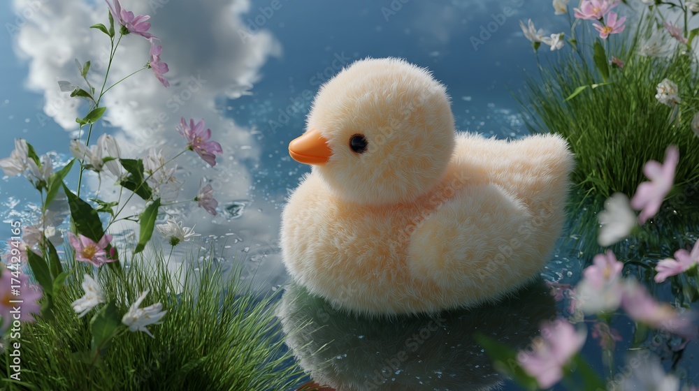 WEBLUX obraz na plátně 1D, 3D, 4D, 5D - Soft duckling toy floating on calm water surrounded by vibrant flowers at midday