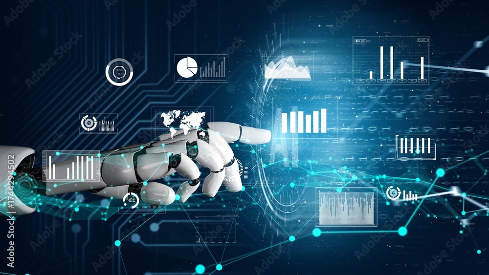 WEBLUX obraz na plátně 1D, 3D, 4D, 5D - A futuristic robotic hand interacts with various data visualizations and digital graphs, symbolizing the integration of technology and data-driven innovation in modern industries. Xenic
