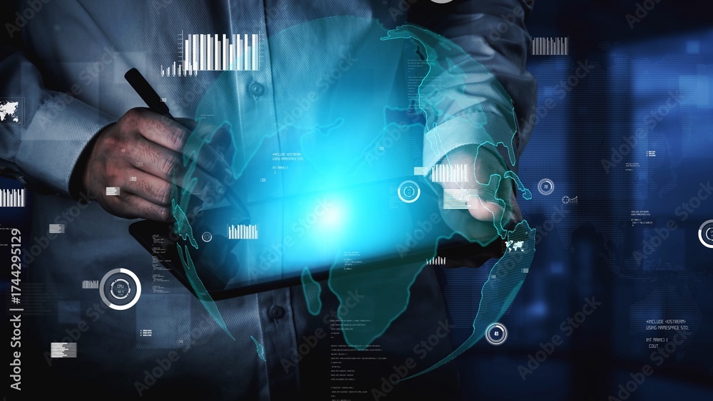 WEBLUX obraz na plátně 1D, 3D, 4D, 5D - A professional person interacts with a tablet displaying global data visualizations, showcasing charts and graphs in a modern and dynamic digital workspace. Xenic