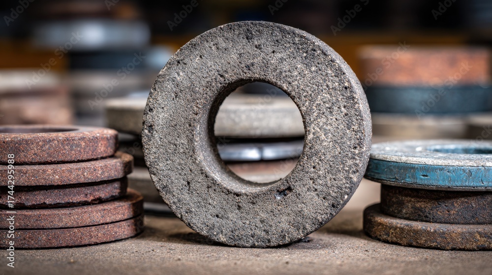 WEBLUX obraz na plátně 1D, 3D, 4D, 5D - Medium shot showcasing used drum brake shoes stacked neatly central component sharply detailed with surrounding parts gently out of focus.