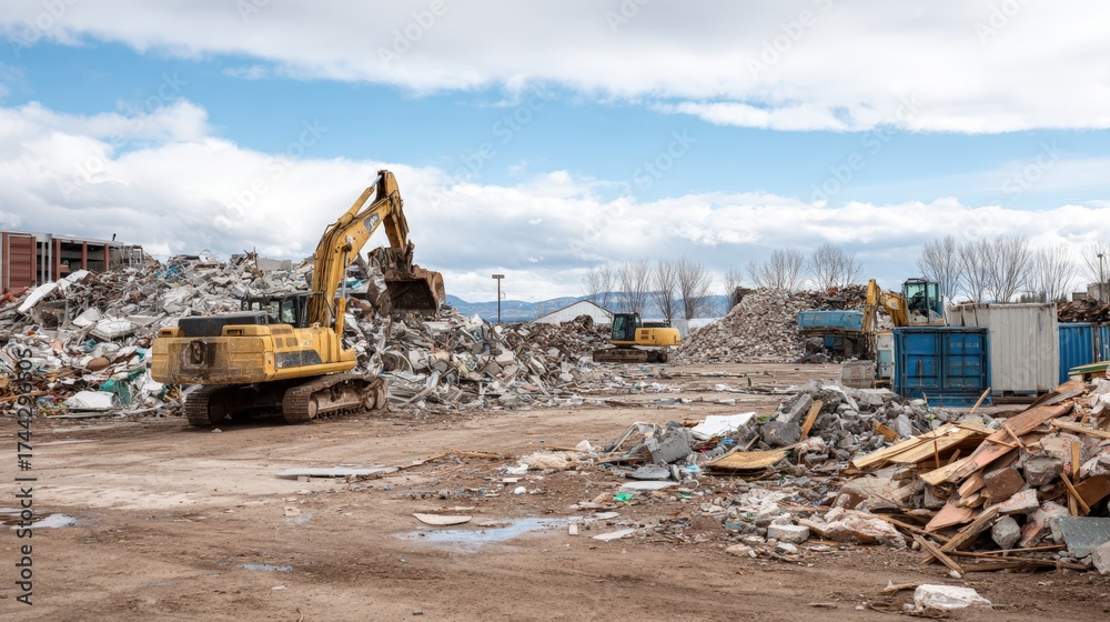 WEBLUX obraz na plátně 1D, 3D, 4D, 5D - Construction crew sorting mixed debris including concrete metal and wood organizing waste materials after a building demolition for proper disposal
