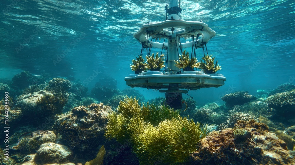 WEBLUX obraz na plátně 1D, 3D, 4D, 5D - Medium shot of an underwater vessel docking station with blurred coral reefs in the background highlighting the vessels secure anchoring platform in clear water.