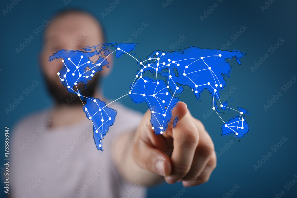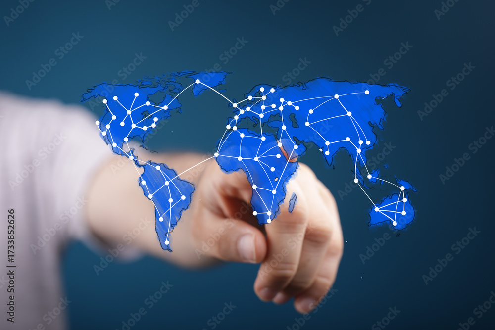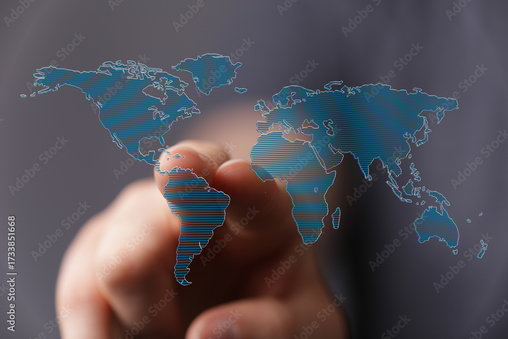 WEBLUX obraz na plátně 1D, 3D, 4D, 5D - Hand pointing at world map, global network, international business, connection, technology, future, growth, success, innovation, digi