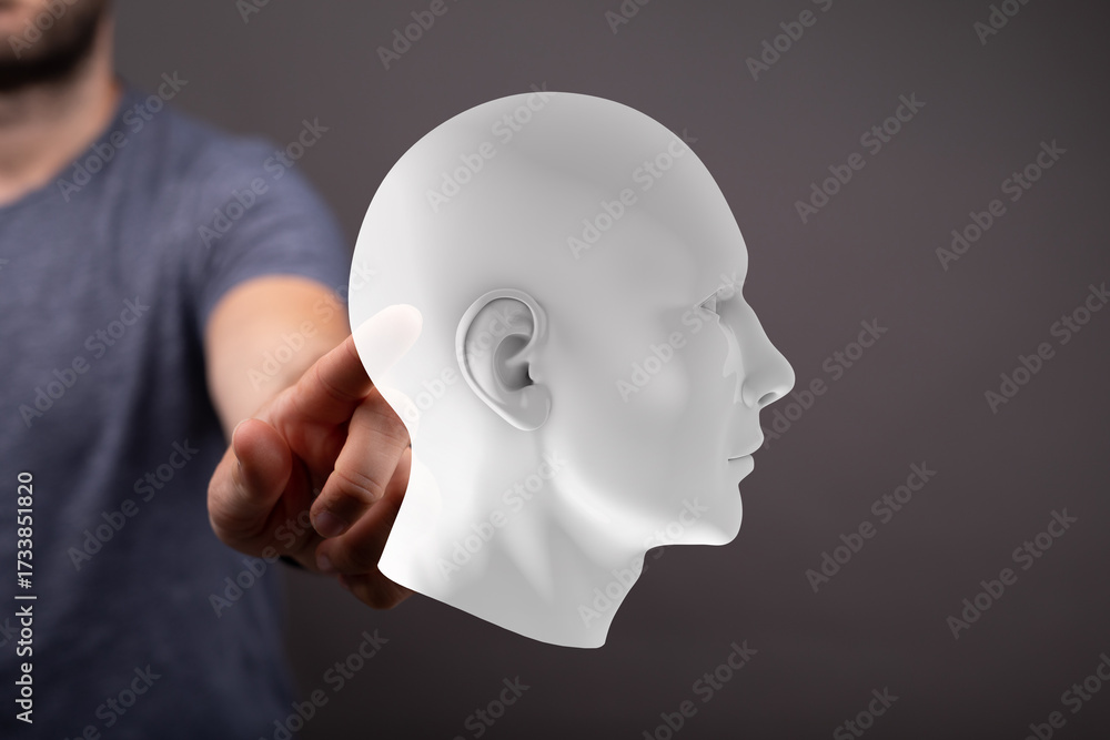 WEBLUX obraz na plátně 1D, 3D, 4D, 5D - Conceptual image of a man interacting with a digital human head, representing AI, technology, or the future.