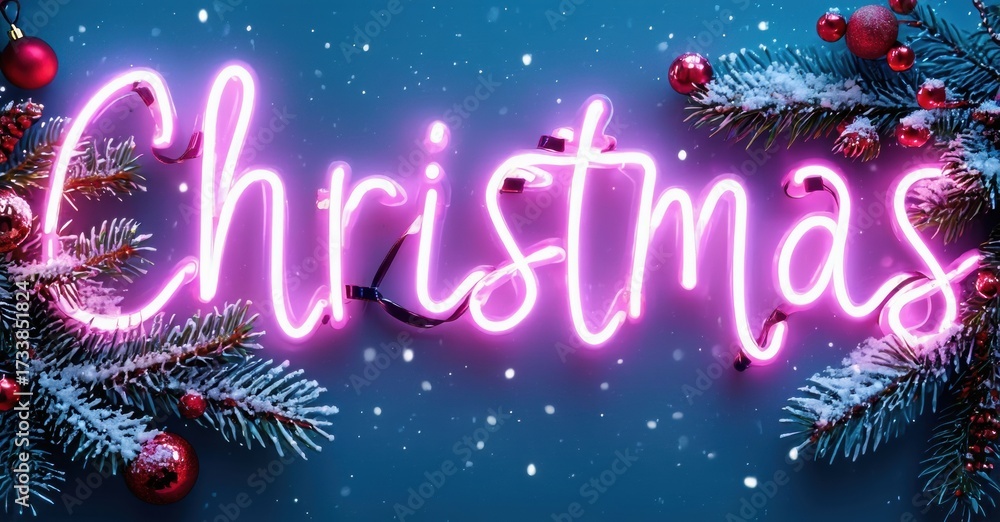 WEBLUX obraz na plátně 1D, 3D, 4D, 5D - Bright pink neon sign spells Christmas. Evergreen branches, red berries, snowflakes create festive winter scene. Holiday spirit radiates.