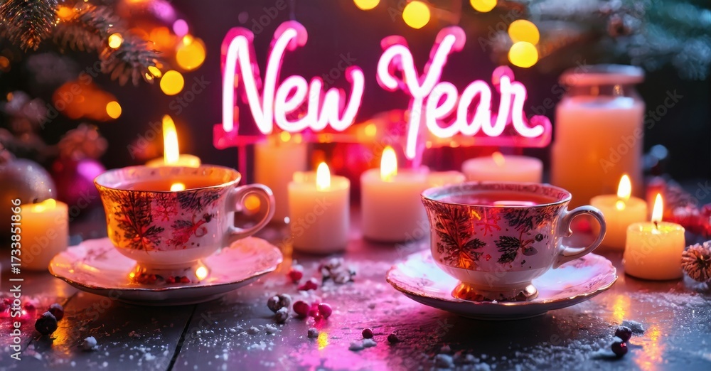WEBLUX obraz na plátně 1D, 3D, 4D, 5D - Festive scene. Two teacups, candles illuminate New Year neon sign. Warm lighting creates cozy holiday atmosphere.