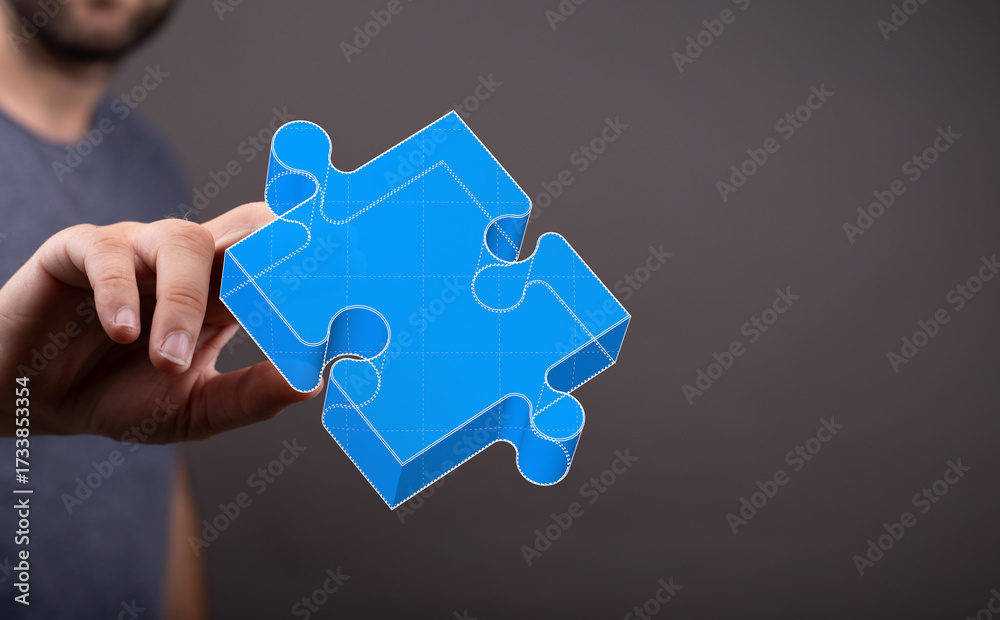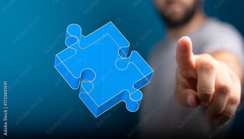 WEBLUX obraz na plátně 1D, 3D, 4D, 5D - Conceptual image of a person interacting with a 3D puzzle piece, symbolizing teamwork, solutions, and problem solving in business. Perfect for m