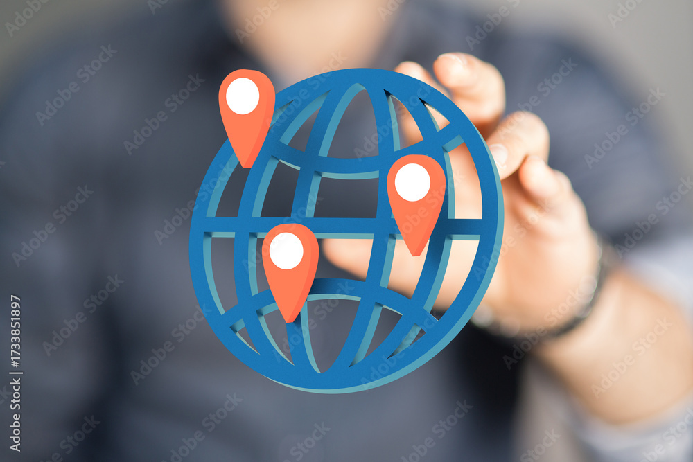 WEBLUX obraz na plátně 1D, 3D, 4D, 5D - Hand holding digital globe with location pins. Global network, connectivity, worldwide reach.