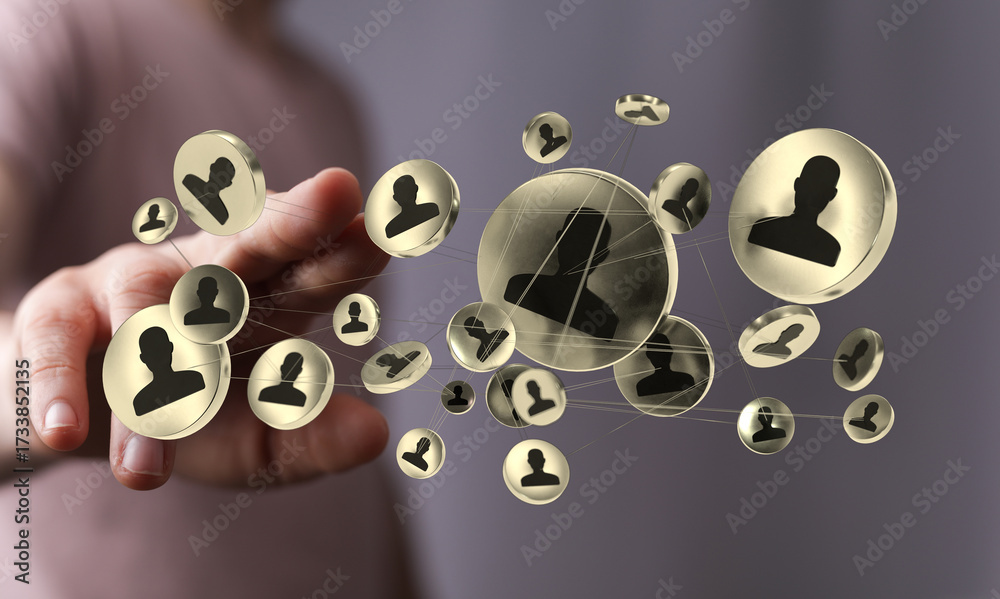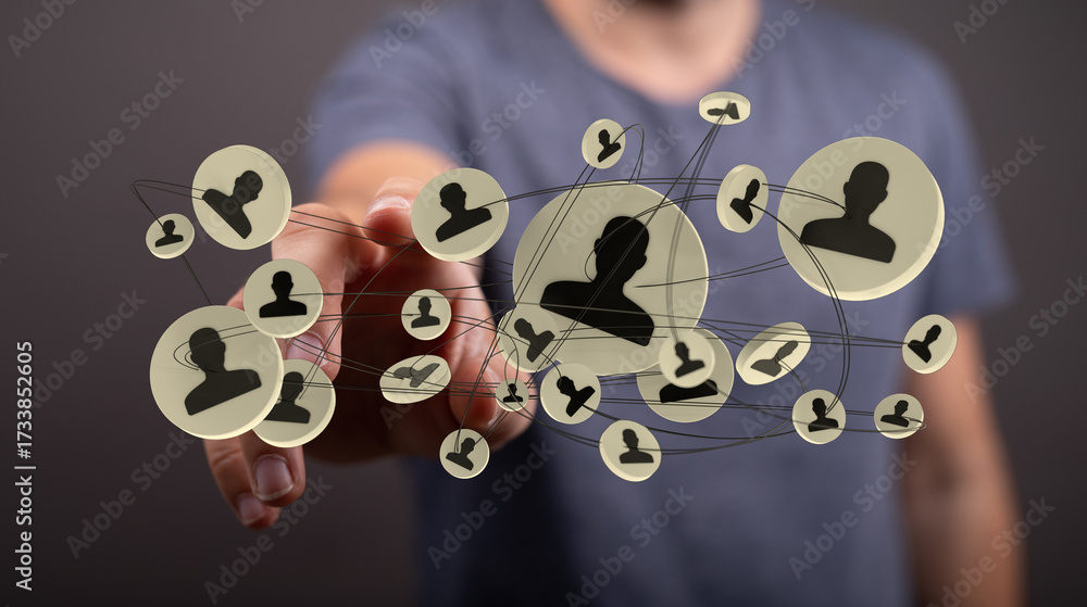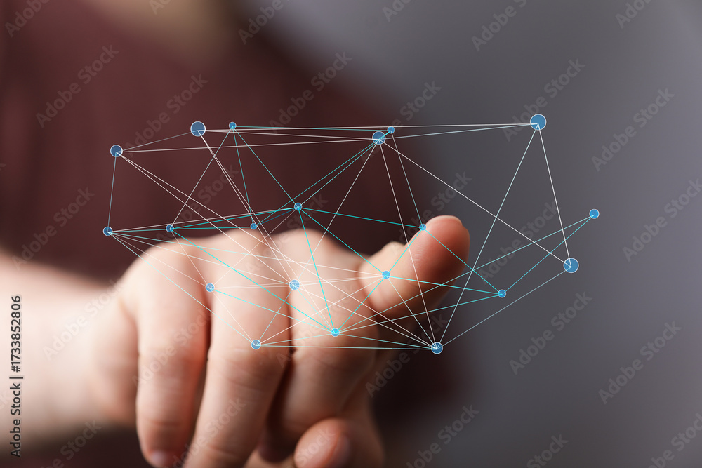 WEBLUX obraz na plátně 1D, 3D, 4D, 5D - Illustration of a person`s hand interacting with a virtual network of people. Connection, communication and collaboration concept.