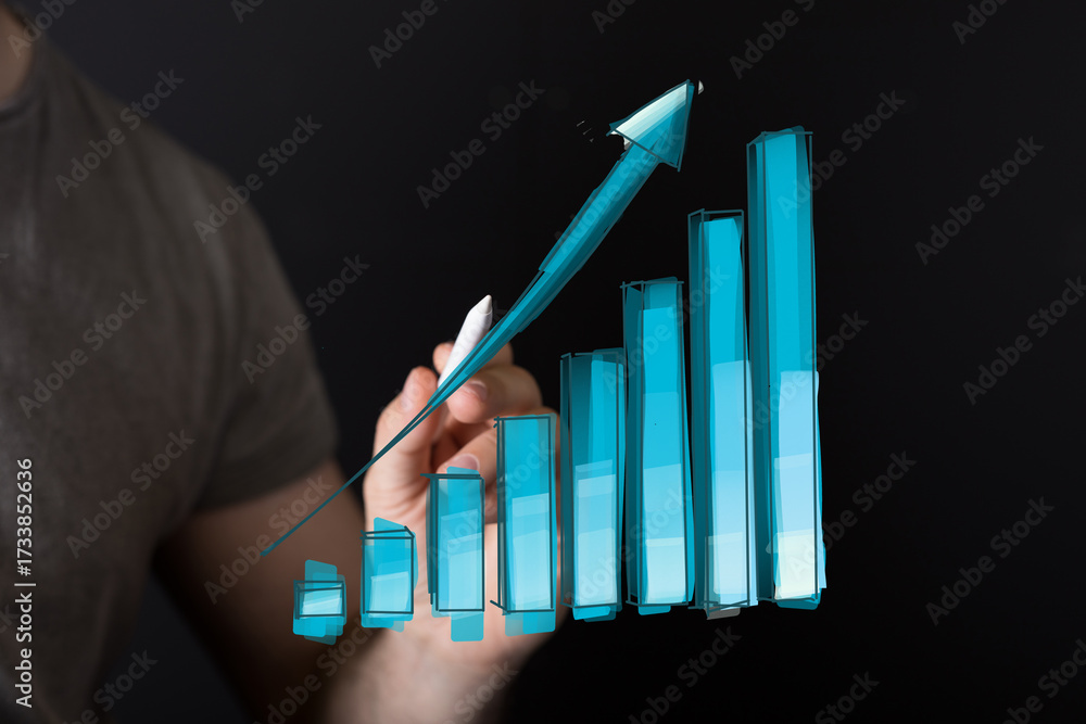 WEBLUX obraz na plátně 1D, 3D, 4D, 5D - Stock photo of a hand interacting with a rising bar graph, symbolizing growth and success.
