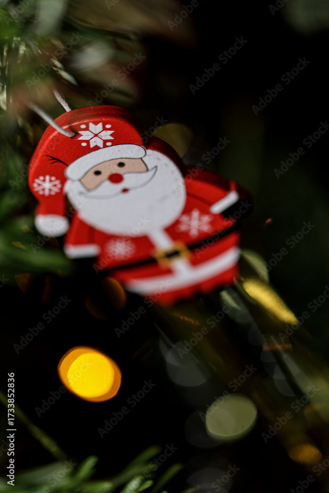WEBLUX obraz na plátně 1D, 3D, 4D, 5D - Close-up of a cute wooden Santa Claus ornament hanging on a Christmas tree with bokeh lights.