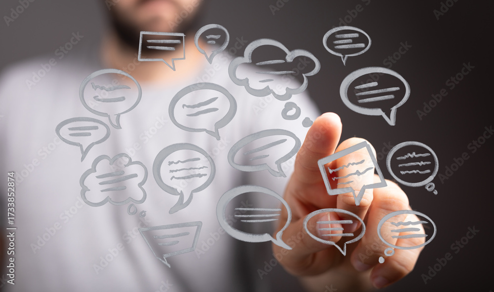 WEBLUX obraz na plátně 1D, 3D, 4D, 5D - A hand interacts with speech bubbles, symbolizing communication, discussion, and network. Conceptual image for online conversations.