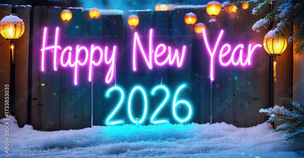 WEBLUX obraz na plátně 1D, 3D, 4D, 5D - Bright neon sign displays Happy New Year 2026. Snowy background features festive lights, wooden fence. Winter celebration imagery.