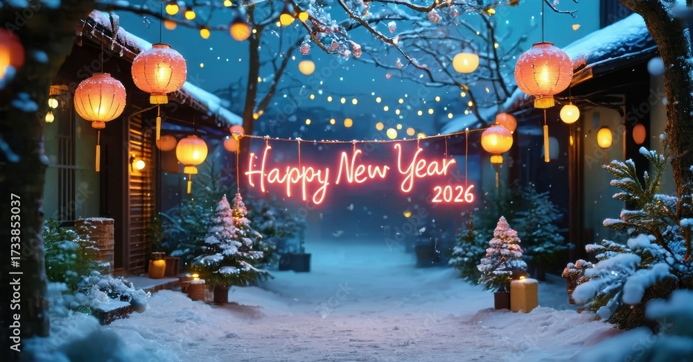 WEBLUX obraz na plátně 1D, 3D, 4D, 5D - Snowy street scene. Lanterns illuminate path toward bright Happy New Year 2026 sign. Festive winter holiday ambiance.