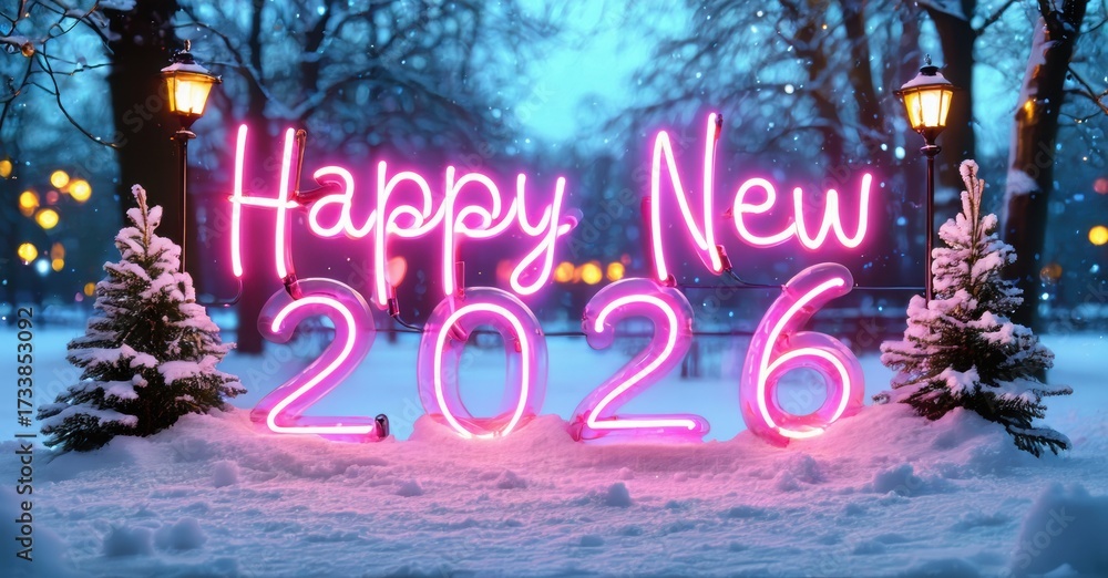 WEBLUX obraz na plátně 1D, 3D, 4D, 5D - Bright neon sign displays Happy New 2026. Snowy park scene with trees, lamps, winter atmosphere. Festive holiday greeting.
