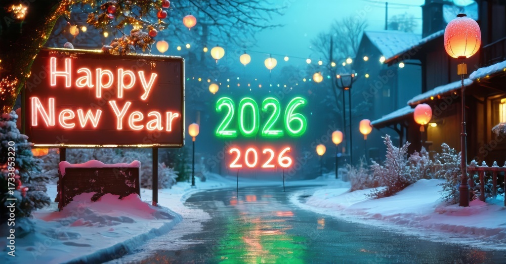 WEBLUX obraz na plátně 1D, 3D, 4D, 5D - Festive street scene. Bright neon signs display Happy New Year and year 2026. Snowy landscape, illuminated lanterns create warm glow.