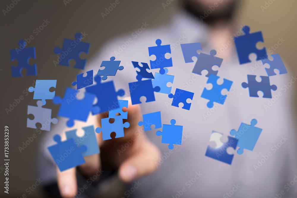 WEBLUX obraz na plátně 1D, 3D, 4D, 5D - Conceptual image of a hand interacting with floating puzzle pieces, representing concepts like teamwork, strategy, solutions, and collaboration.