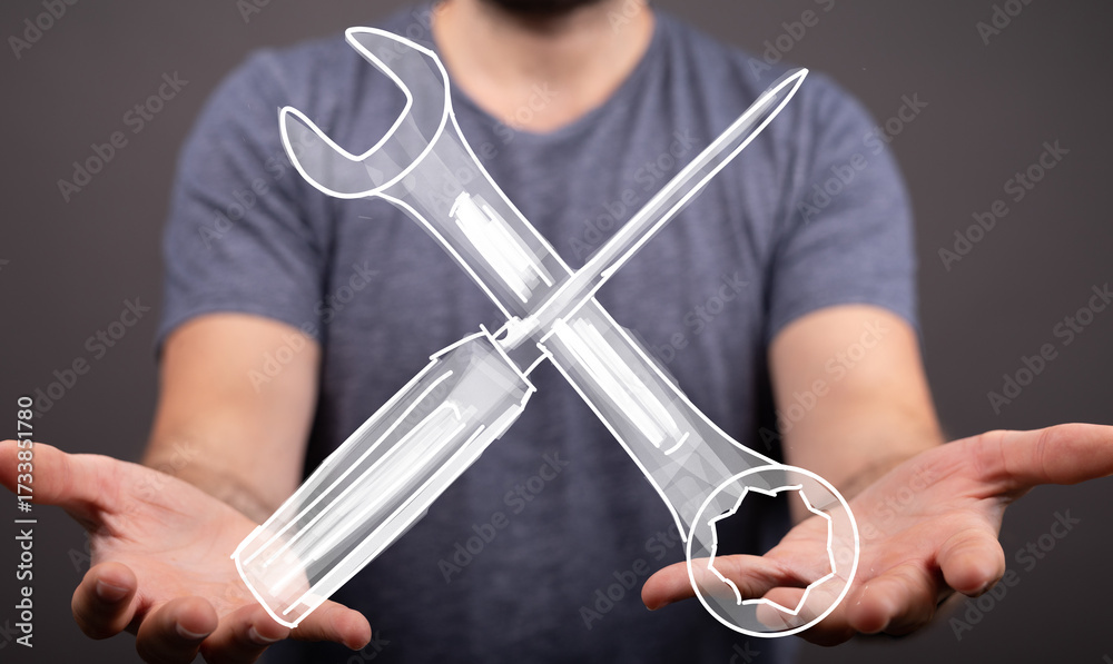 WEBLUX obraz na plátně 1D, 3D, 4D, 5D - Image of a man presenting crossed wrench and screwdriver icons, symbolizing repair, maintenance, or solutions.