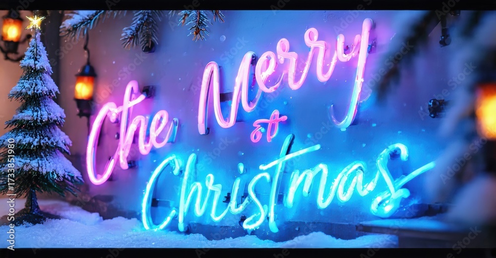 WEBLUX obraz na plátně 1D, 3D, 4D, 5D - Festive scene depicts bright neon sign reading Merry Christmas. Snow covers ground, lights illuminate winter landscape. Holiday spirit visible.