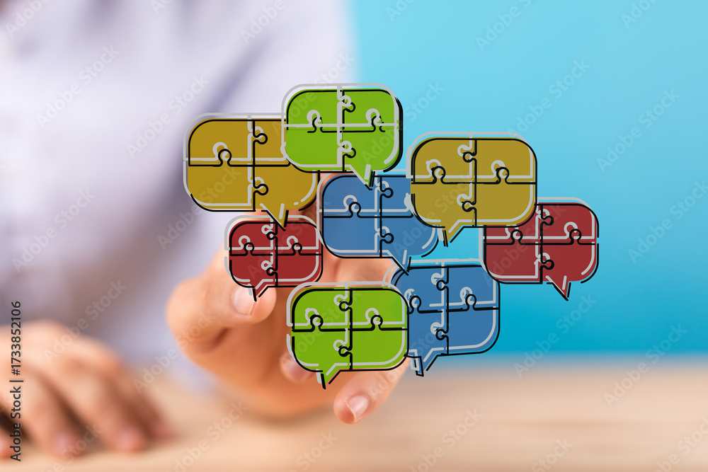 WEBLUX obraz na plátně 1D, 3D, 4D, 5D - A close-up shot of a hand holding puzzle-shaped speech bubbles, symbolizing communication, teamwork, and ideas. This image is perfect for illust