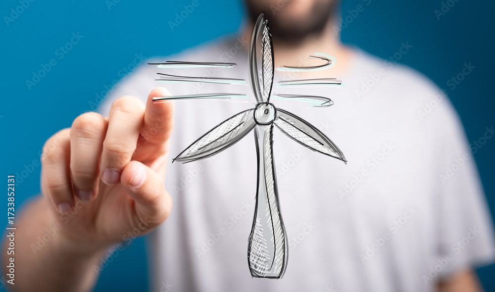WEBLUX obraz na plátně 1D, 3D, 4D, 5D - Hand pointing at a wind turbine sketch, representing clean energy, sustainability, and innovation.