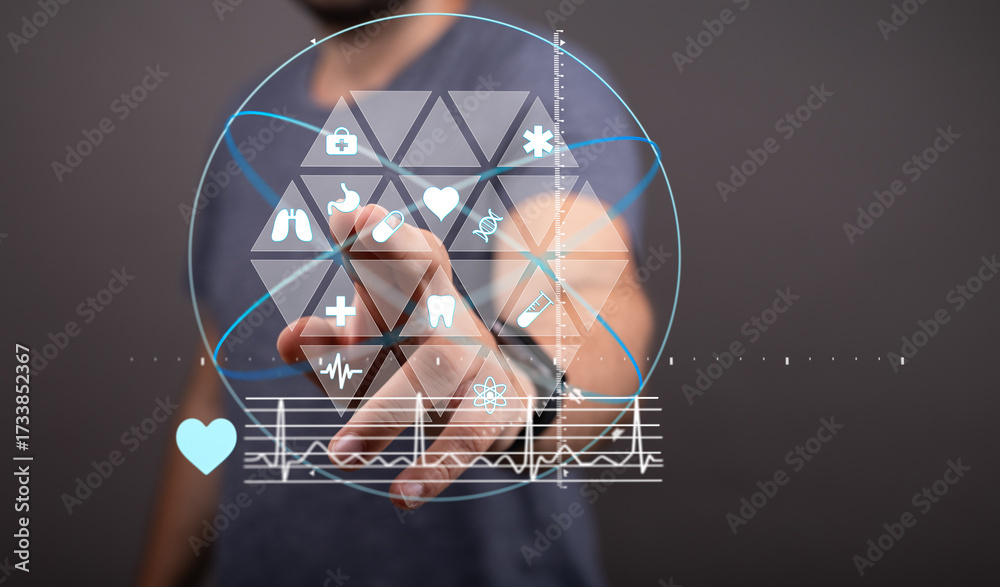 WEBLUX obraz na plátně 1D, 3D, 4D, 5D - Person uses digital interface showing medical icons, representing telehealth, technology, and healthcare.