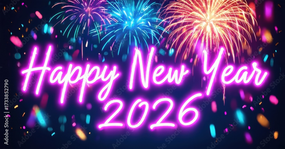 WEBLUX obraz na plátně 1D, 3D, 4D, 5D - Bright neon sign displays Happy New Year 2026 over colorful fireworks. Festive celebration imagery dominates composition.