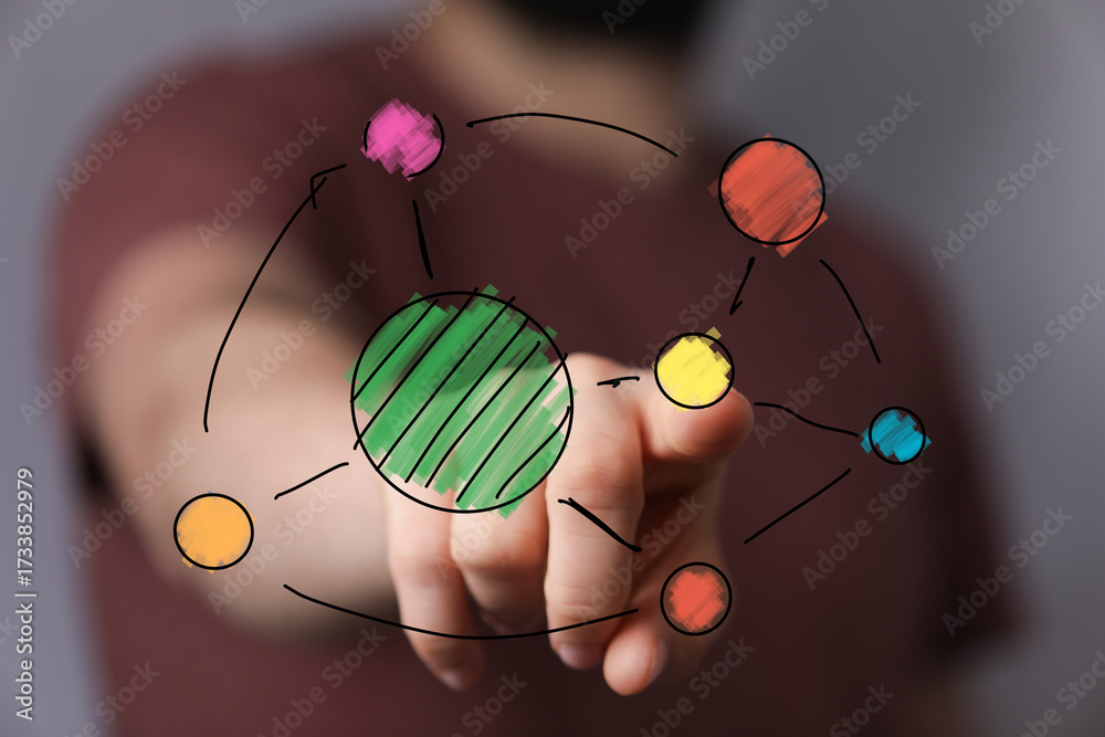 WEBLUX obraz na plátně 1D, 3D, 4D, 5D - Image of a hand pointing at a colorful network diagram, ideal for presentations on connection, strategy, and planning.