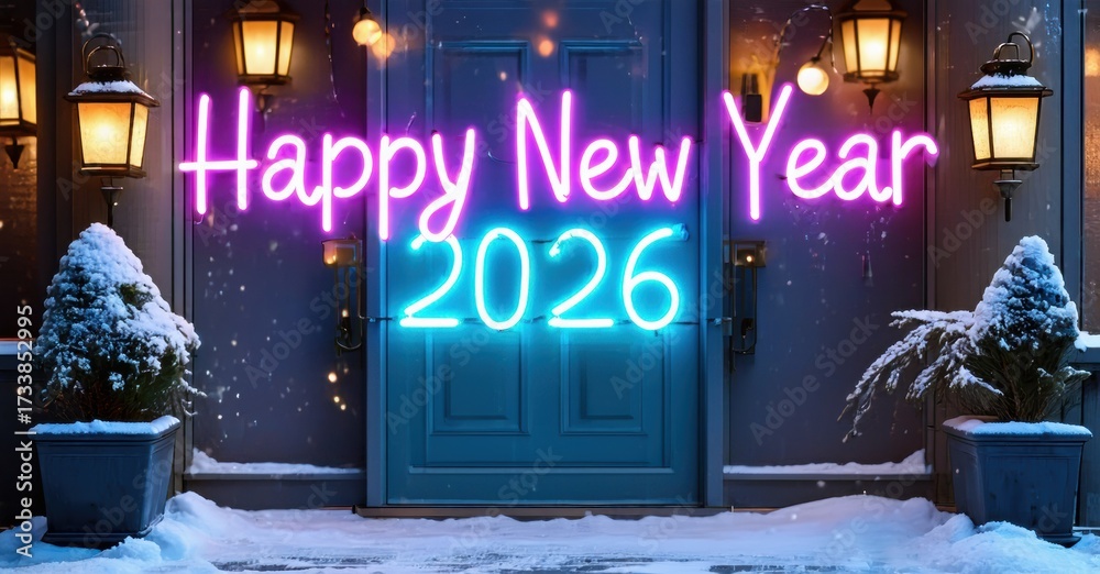 WEBLUX obraz na plátně 1D, 3D, 4D, 5D - Festive doorway displays bright neon Happy New Year 2026 message. Snow covers plants, steps, creating winter scene.