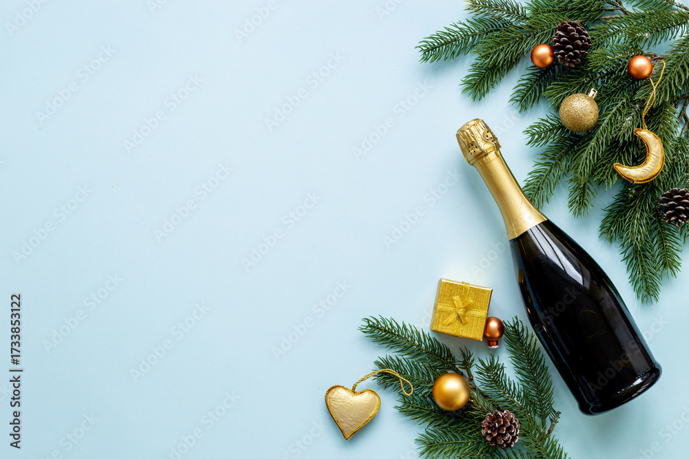 WEBLUX obraz na plátně 1D, 3D, 4D, 5D - Christmas fir tree branch with champagne bottle and decoration, top view. Happy New Year greeting card