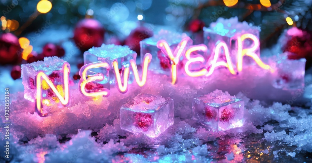 WEBLUX obraz na plátně 1D, 3D, 4D, 5D - Bright neon New Year sign rests within ice cubes. Festive background features blurred holiday decorations, snow, vibrant colors.