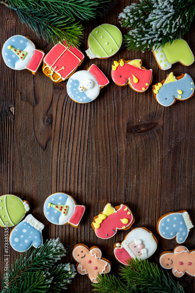 WEBLUX obraz na plátně 1D, 3D, 4D, 5D - Flat lay of Christmas gingerbread cookies and New Year with fir branches on dark wooden background, top view. Greeting concept