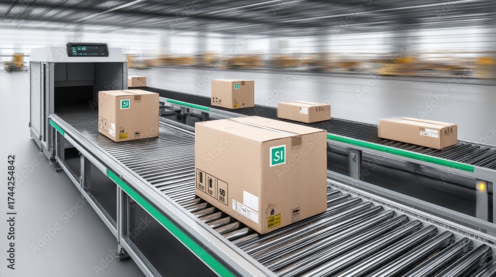 WEBLUX obraz na plátně 1D, 3D, 4D, 5D - Focused medium shot of smart conveyors organizing bulk and delicate goods together highlighting AI precision in shipping prep with a blurred industrial backdrop.