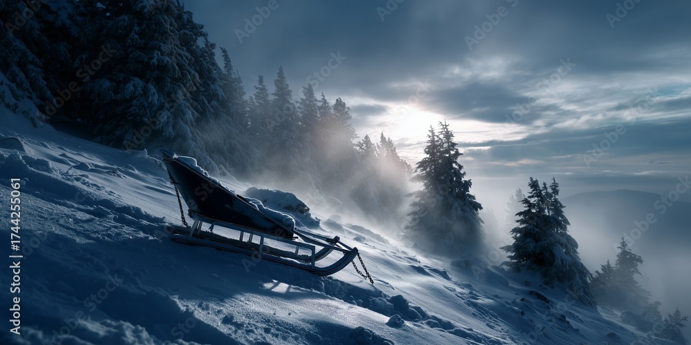 WEBLUX obraz na plátně 1D, 3D, 4D, 5D - Snow-covered landscape with a lone sled resting against pine trees at dusk
