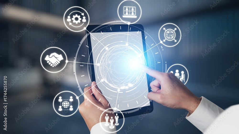 WEBLUX obraz na plátně 1D, 3D, 4D, 5D - People networking and digital community with teamwork, partnership, collaboration and connection icons showing modern communication and relationship building. Gist