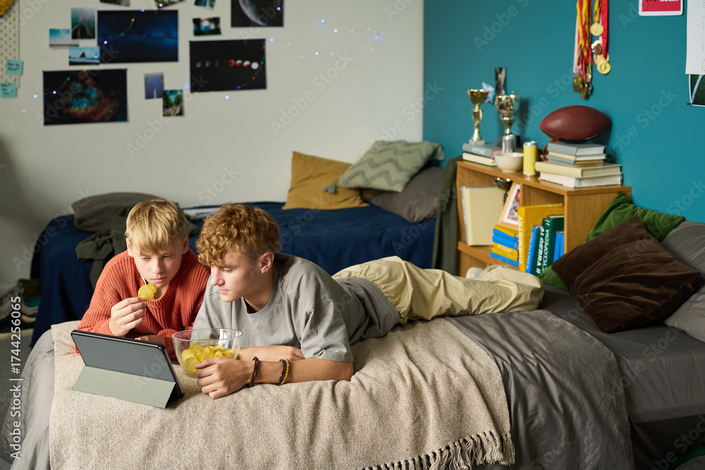 WEBLUX obraz na plátně 1D, 3D, 4D, 5D - Two Caucasian teenage boys lying on bed watching tablet screen together, eating snacks from bowl, bedroom decorated with sports trophies and photos, brothers spending time together