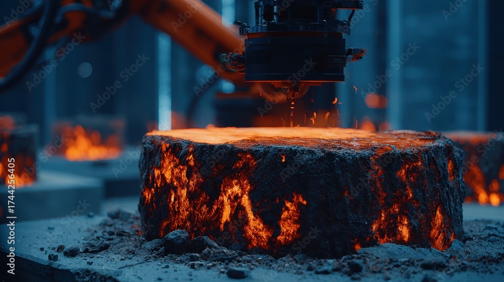 WEBLUX obraz na plátně 1D, 3D, 4D, 5D - Medium shot focusing on a robot arm adjusting a bezel setting around a vibrant stone with outoffocus workshop elements creating depth.