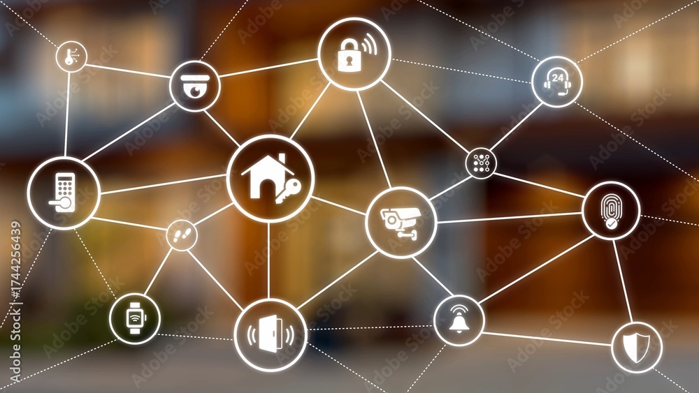 WEBLUX obraz na plátně 1D, 3D, 4D, 5D - Home security icons show smart home, surveillance, and safety devices. Home security ensures monitoring, home security protection, and smart access. Gist