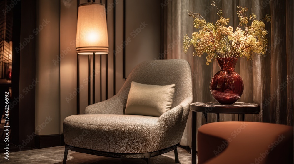 WEBLUX obraz na plátně 1D, 3D, 4D, 5D - Private VIP lounge space featuring a comfortable chair and soft lighting with surrounding lounge elements softly blurred for a refined atmosphere.