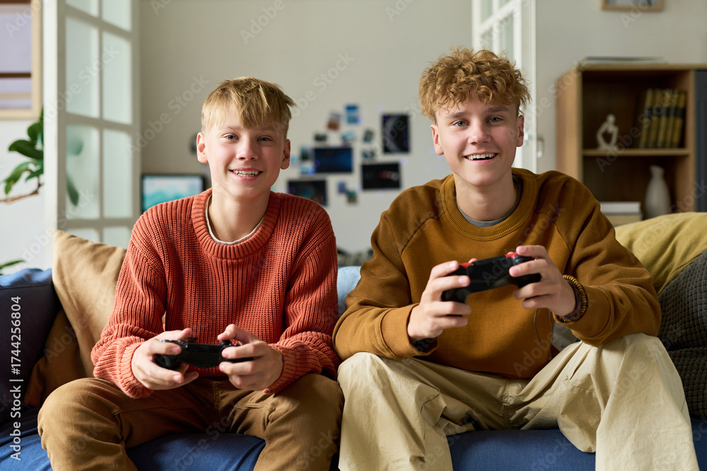 WEBLUX obraz na plátně 1D, 3D, 4D, 5D - Portrait of two Caucasian teenage boys sitting on sofa playing video game together holding controllers smiling at camera, sibling bond in casual home setting