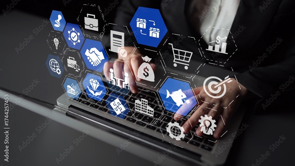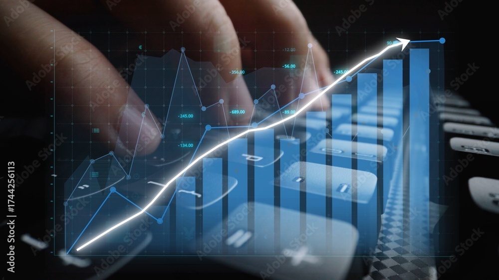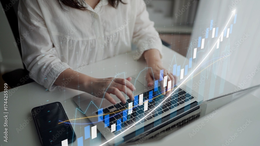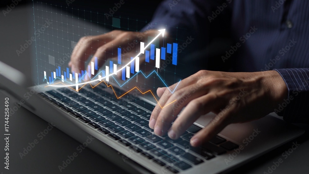 WEBLUX obraz na plátně 1D, 3D, 4D, 5D - A close-up view of hands working on a laptop keyboard, with visually represented charts and graphs illustrating financial trends and growth in a modern workspace. Copula
