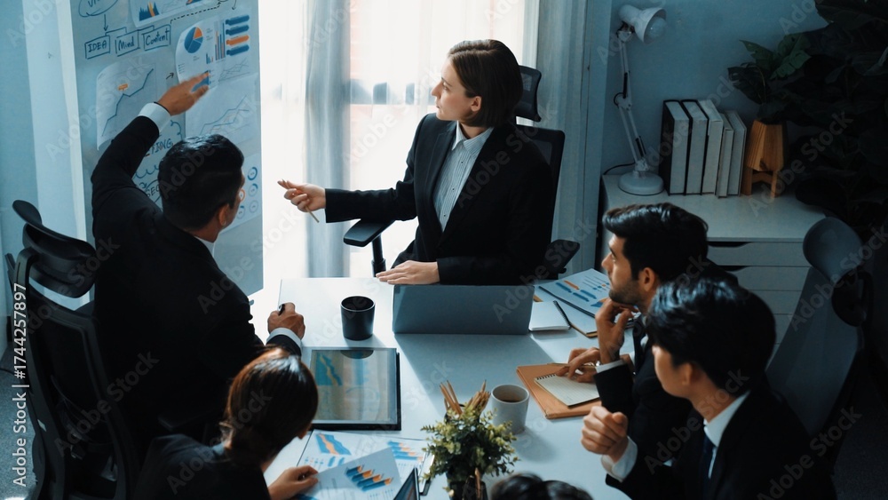 WEBLUX obraz na plátně 1D, 3D, 4D, 5D - Top view of smart executive manager holding stock market investment chart while planning marketing strategy with diverse group. Smart business team brainstorming and working together. Directorate.
