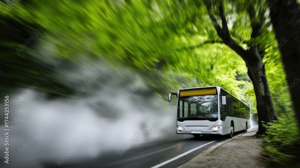 WEBLUX obraz na plátně 1D, 3D, 4D, 5D - Biofuel bus in motion on a treelined road sharp focus on exhaust pipe with faint smoke and blurred lush environment symbolizing cleaner emission efforts.