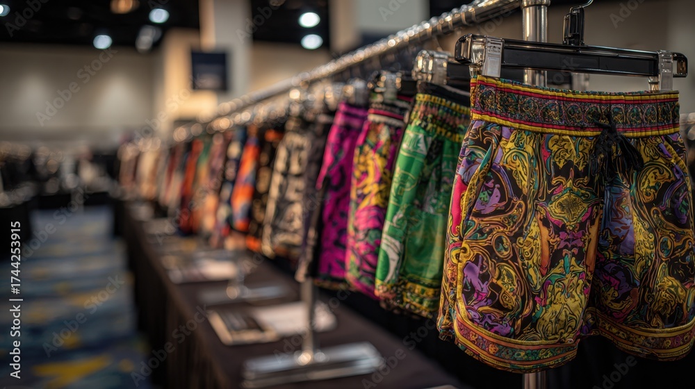 WEBLUX obraz na plátně 1D, 3D, 4D, 5D - Focused medium shot showcasing a pair of custom printed shorts displayed on a rack highlighting intricate patterns and fabric quality while the surrounding booth elements remain