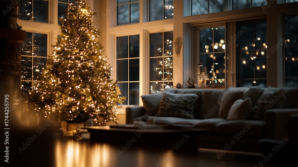 WEBLUX obraz na plátně 1D, 3D, 4D, 5D - Cozy holiday living room with a decorated Christmas tree and warm ambient lights