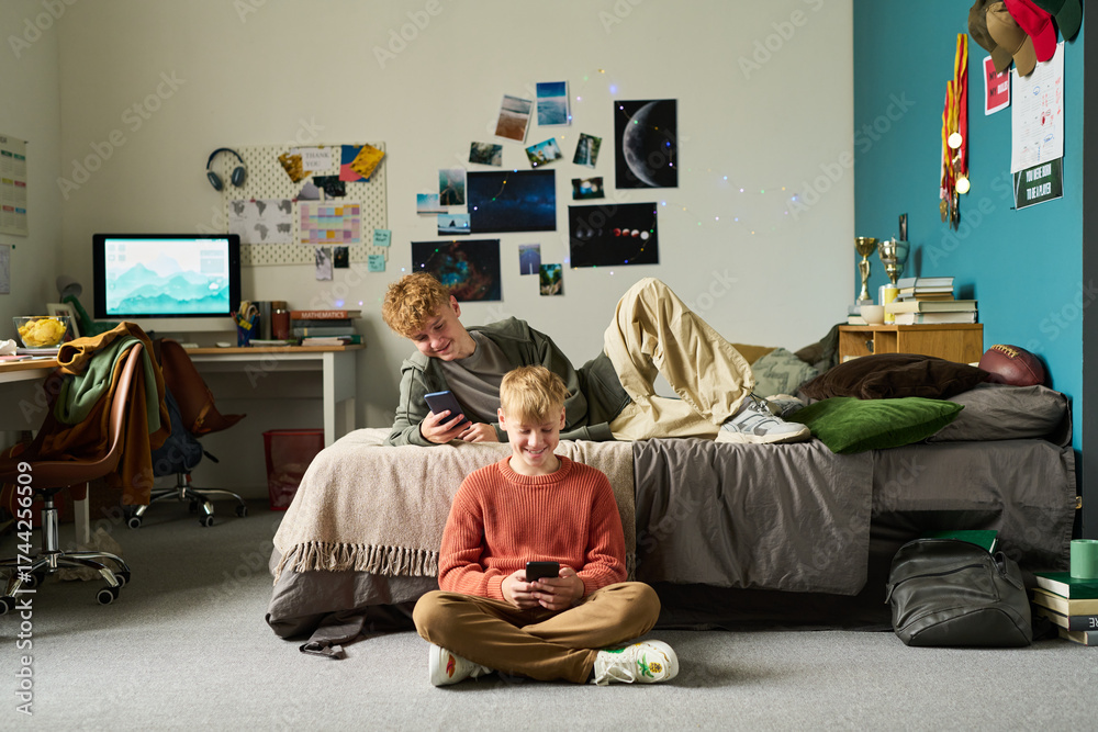 WEBLUX obraz na plátně 1D, 3D, 4D, 5D - Two Caucasian teenage brothers spending time together in bedroom, one sitting on floor using smartphone, other lying on bed holding tablet, science posters on wall