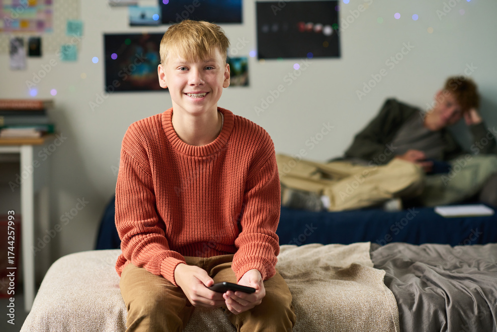 WEBLUX obraz na plátně 1D, 3D, 4D, 5D - Portrait of Caucasian teenage boy sitting on bed holding smartphone smiling at camera, with another Caucasian teenage boy reclining on bed in background using digital tablet