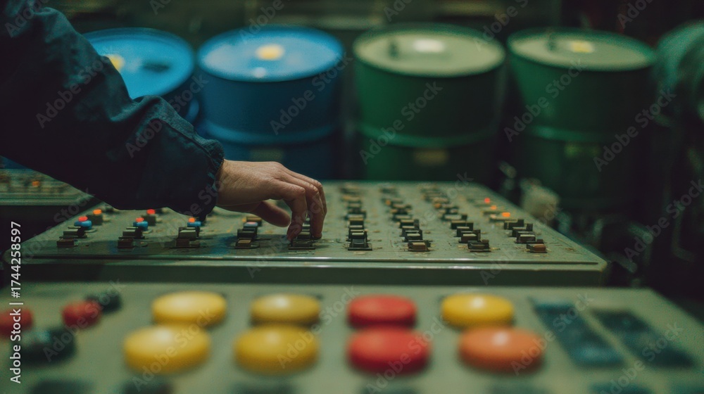 WEBLUX obraz na plátně 1D, 3D, 4D, 5D - Focused medium shot of a technician operating an incineration control panel with chemical waste drums softly blurred in the background.